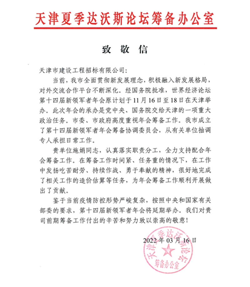日前,天咨公司所屬招標(biāo)公司收到天津夏季達(dá)沃斯論壇籌備辦公室發(fā)來的致敬信,充分肯定了招標(biāo)公司為天津夏季達(dá)沃斯論壇年會籌備工作所作的積極努力。