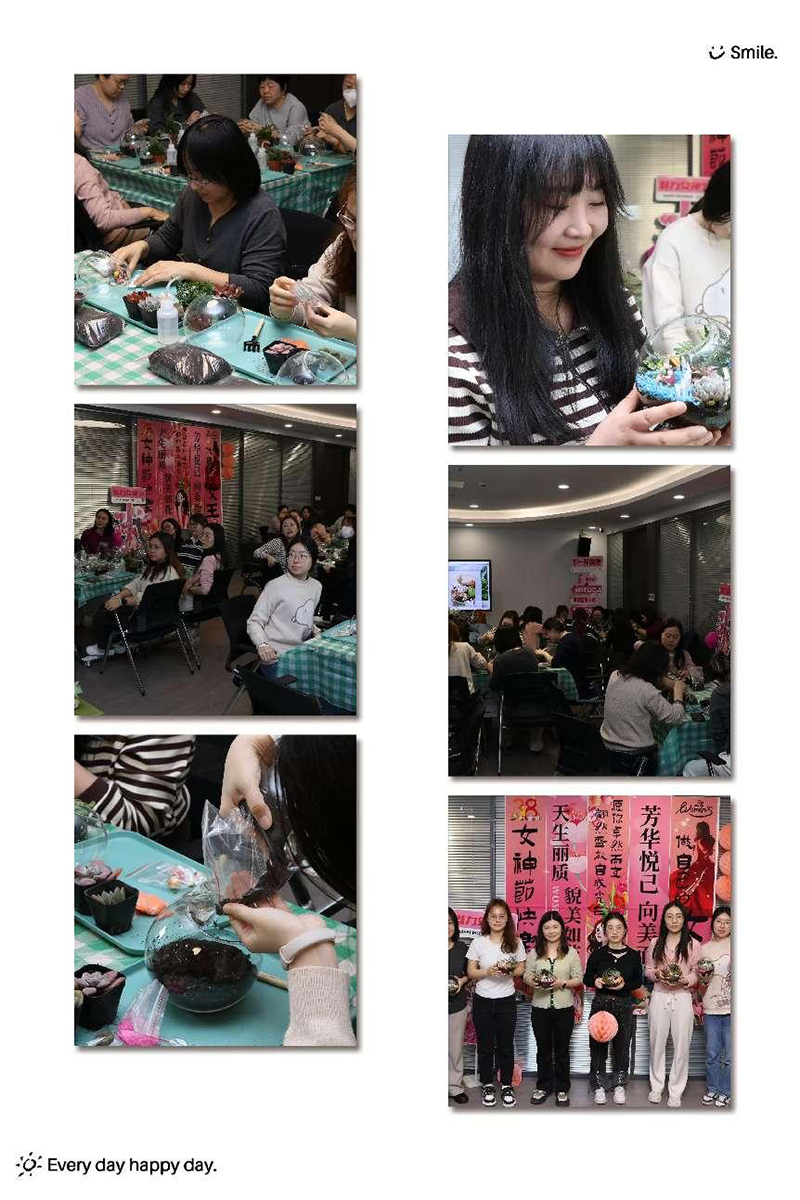 宏亞公司工會組織了“柔光萬丈,自在生長”微景觀DIY主題活動,女職工們用靈巧的雙手將方寸玻璃瓶化作詩意天地,有人打造出“苔痕上階綠”的古典庭院,有人構思出“小橋流水人家”的田園牧歌,活動現(xiàn)場歡聲笑語不斷,大家在綠意盎然的創(chuàng)意世界中感受春日美好,共度溫馨時光。