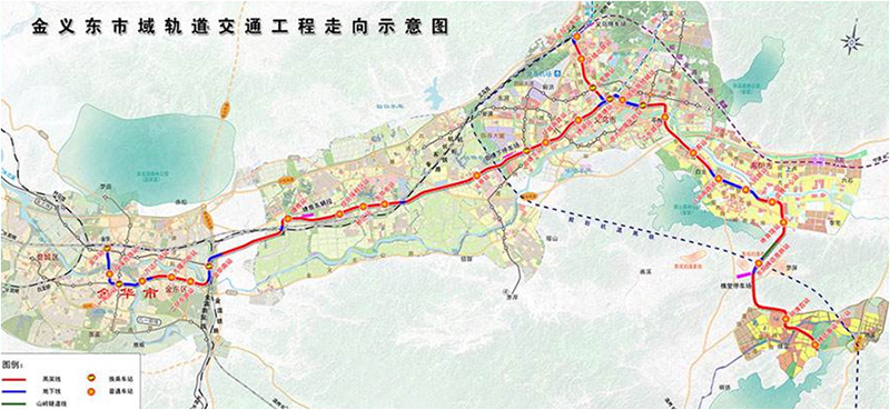 項目建設規(guī)模由金華—義烏和義烏—東陽兩條線路組成,兩線在秦塘站呈雙島四線同站臺換乘。其中,金華—義烏線起于金華火車站,沿雙龍街-李漁路-李漁東路-站前路-金義新區(qū)新城路-規(guī)劃國貿(mào)大道二期-國貿(mào)大道一期,止于義烏秦塘站;義烏—東陽線起于義烏火車站,沿宗澤路-國貿(mào)大道-商城大道-陽光大道-世茂大道-興平路-迎賓大道-S218-鎮(zhèn)北路-萬盛北街-橫店環(huán)城東路,止于橫店客運中心。兩條線路總計全長約107.18公里,共設站31座(其中地下站13座,高架站18座),設一段三場,建設地址位于金華地區(qū)(含金華市婺城區(qū)、金東區(qū)、義烏市、東陽市),計劃于2021年建成。