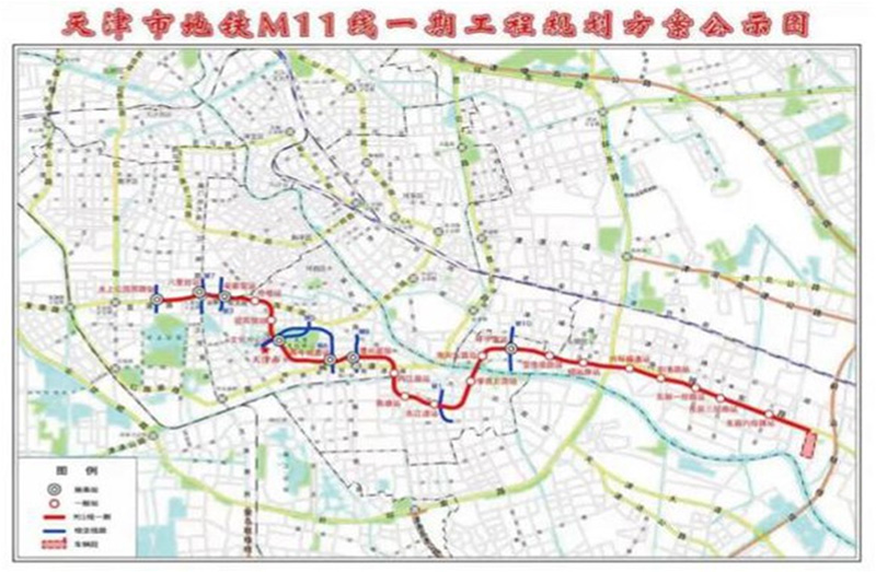 天津地鐵11號(hào)線一期工程線路全長(zhǎng)22.6公里,共設(shè)21座車站,均為地下站。在東麗區(qū)設(shè)置七經(jīng)路定修段一座。本工程設(shè)有兩座主變電所,新建六里臺(tái)主所1座與7號(hào)線共享,新建馴海路主所1座,與Z1線共享,正線設(shè)置牽引變電所11座,定修段獨(dú)立設(shè)置 1座牽引變電所??刂浦行囊惶?,設(shè)置在華苑車輛段內(nèi),另外在七經(jīng)路定修段設(shè)備用控制中心一處。概算總投資256.02億元。